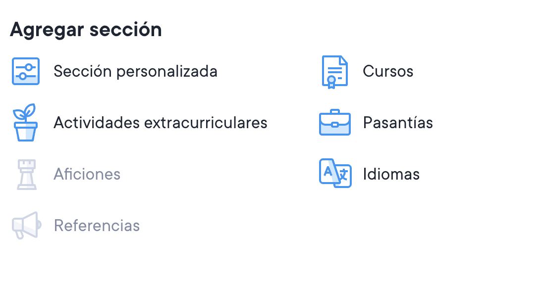 Otra forma de personalizar tu currículum es con secciones personalizadas. Puedes elegir cualquier título que desees para una sección personalizada. Para agregar una sección personalizada, desplázate hasta la parte inferior del editor de currículum a las diferentes opciones para agregar nuevas secciones.