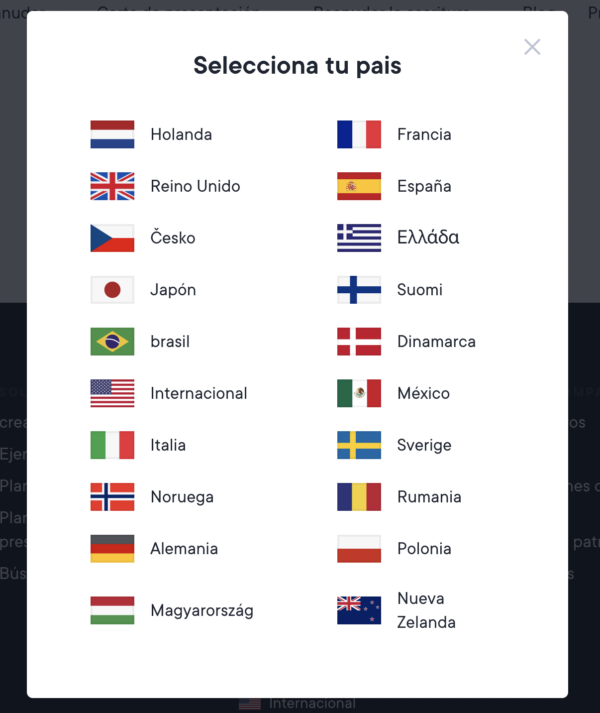 Si estás aquí, es probable que nos hayas encontrado en resume.io, nuestra marca internacional. También tenemos 10 marcas locales adicionales: Nederland, España, Dinamarca, Italia, Polska, Francia, Suomi, Česko, Sverige y Noruega. Si quieres visitar nuestras marcas locales, desplázate hasta la parte inferior de cvapp.mx y haz clic en el emoji de la bandera. Si te registras con una marca local, tu currículum vitae y tu experiencia en la aplicación estarán en el idioma local.*